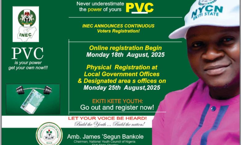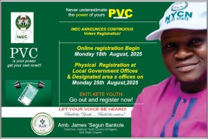 Ekiti State youths have been called upon to seize a pivotal opportunity by obtaining their Permanent Voter Cards (PVCs) in the ongoing registration exercise across all 16 Local Government Areas and LCDAs. Amb. Segun Bankole, Chairman of the National Youth Council of Nigeria (NYCN), Ekiti State Chapter, made this passionate appeal, emphasizing that active participation in voter registration is crucial for economic growth, political relevance, and securing democratic dividends for communities.