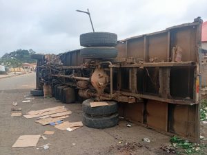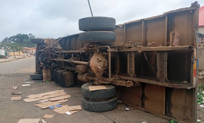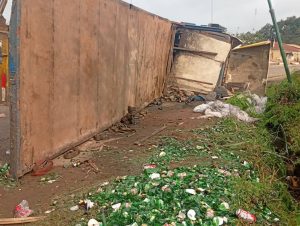 A loaded breweries truck met with an accident along the New Iyin road in the early hours of today after a busted tire caused the vehicle to careen off course near Okasha Junction. The incident resulted in the significant loss of over sixty crates of various beer brands, though thankfully, no lives were lost.