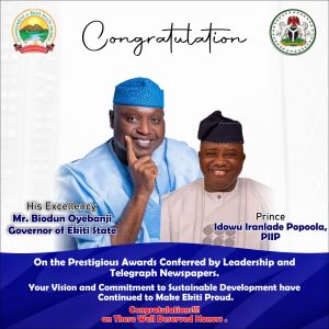 A stalwart of the All Progressives Congress and crown Prince of Otun Ekiti, Prince Idowu Iranlade Popoola has congratulated Ekiti State Governor, Mr Biodun Oyebanji, on the series of prestigious media awards recently conferred on him by Leadership Newspaper and New Telegraph Newspaper, describing the honours as a testament to purposeful governance and visible transformation across the state.