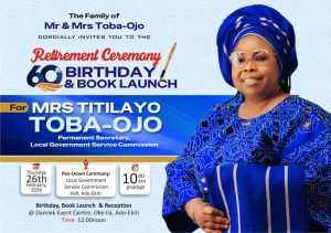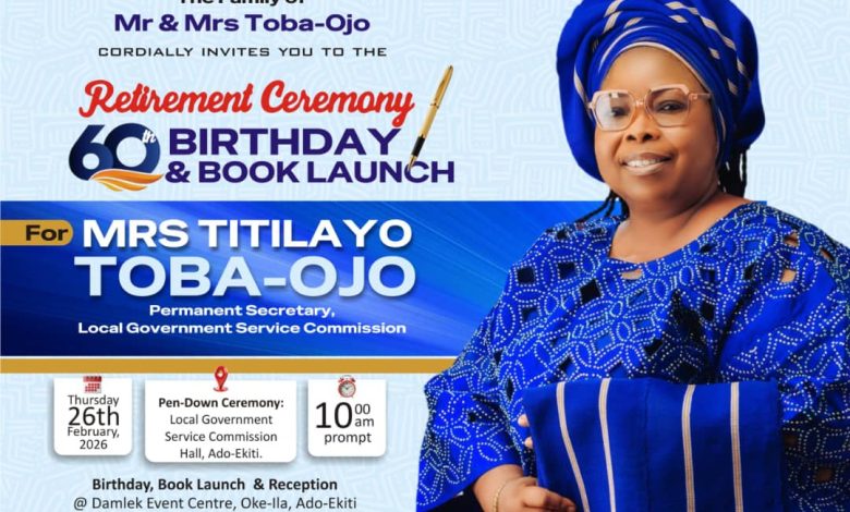 It was a day of tributes, and transition in Ado Ekiti on Thursday as Mrs. Titilayo Toba-Ojo, the first female Permanent Secretary to rise through the ranks in the Ekiti State Local Government service, officially bowed out at 60, closing a remarkable chapter with the launch of her book, The Grassroot Engine.